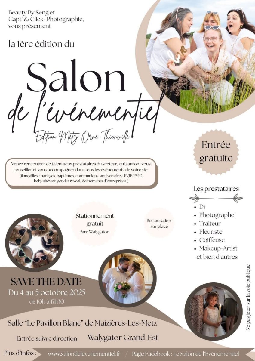 Les 04 et 05 octobre 2025 de 10h à 17h30 aura lieu la première édition du Salon de l’événementiel édition Metz Orne Thionville, à l’espace « Pavillon Blanc » du Walygator (Maizieres-les-Metz).
