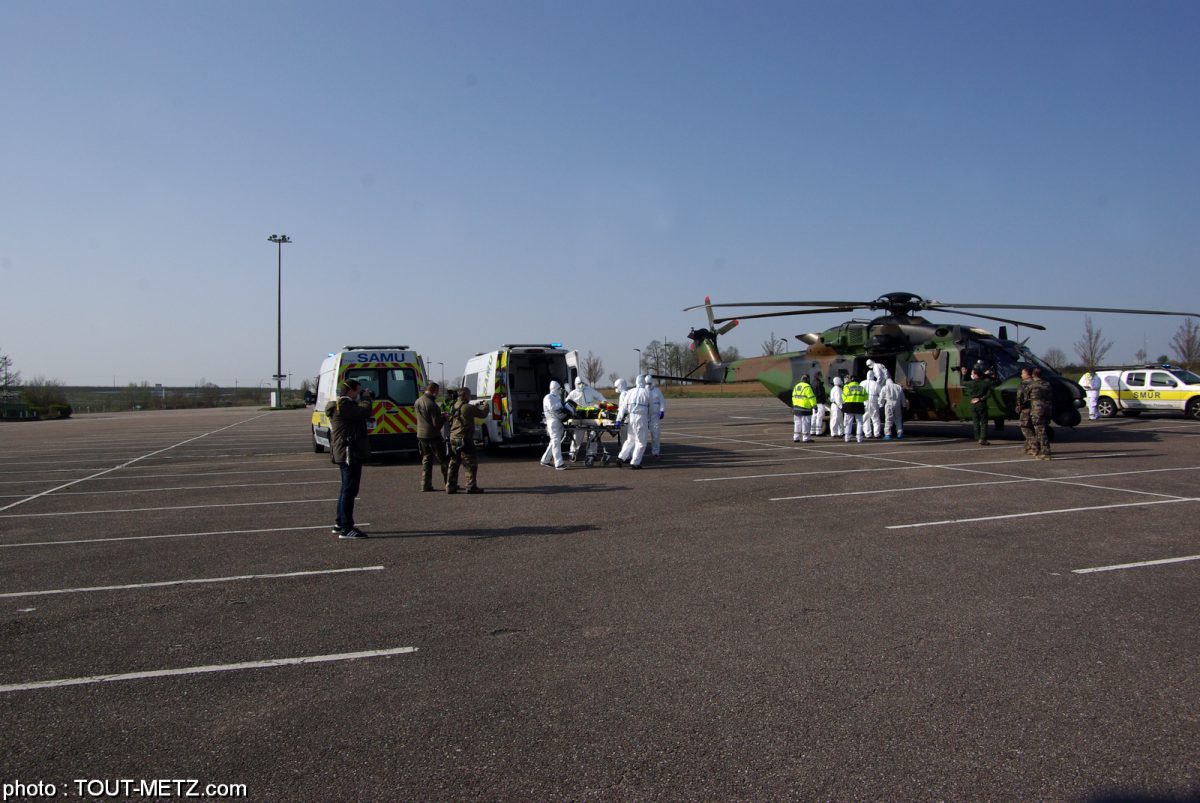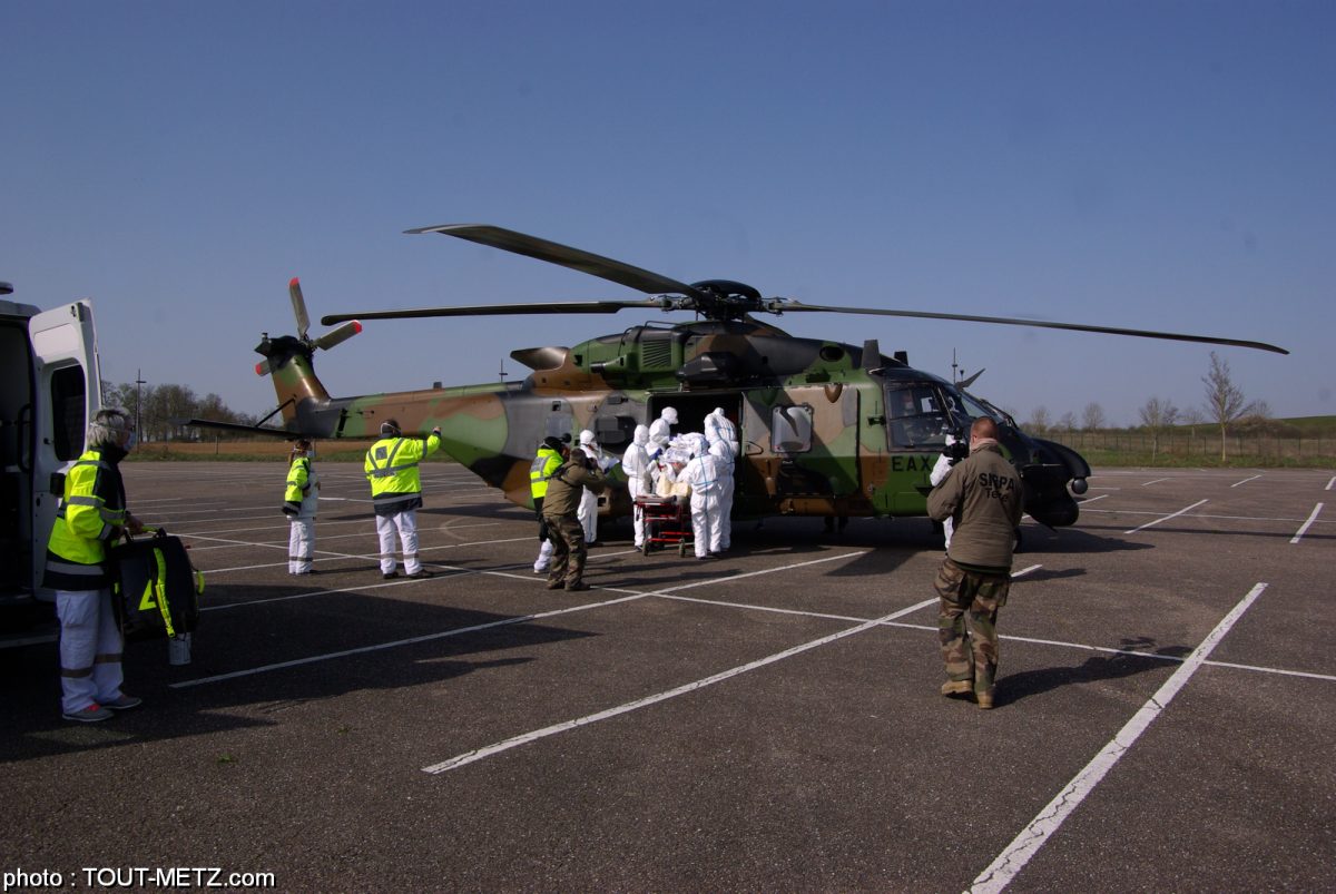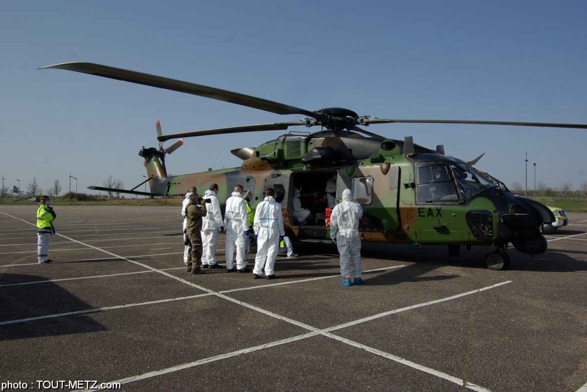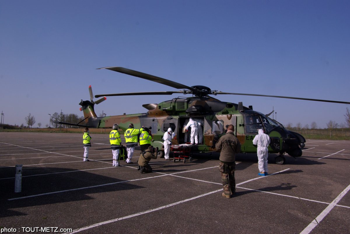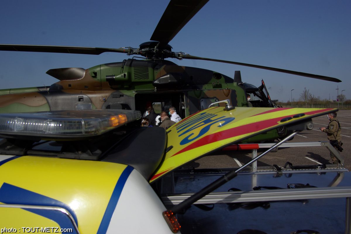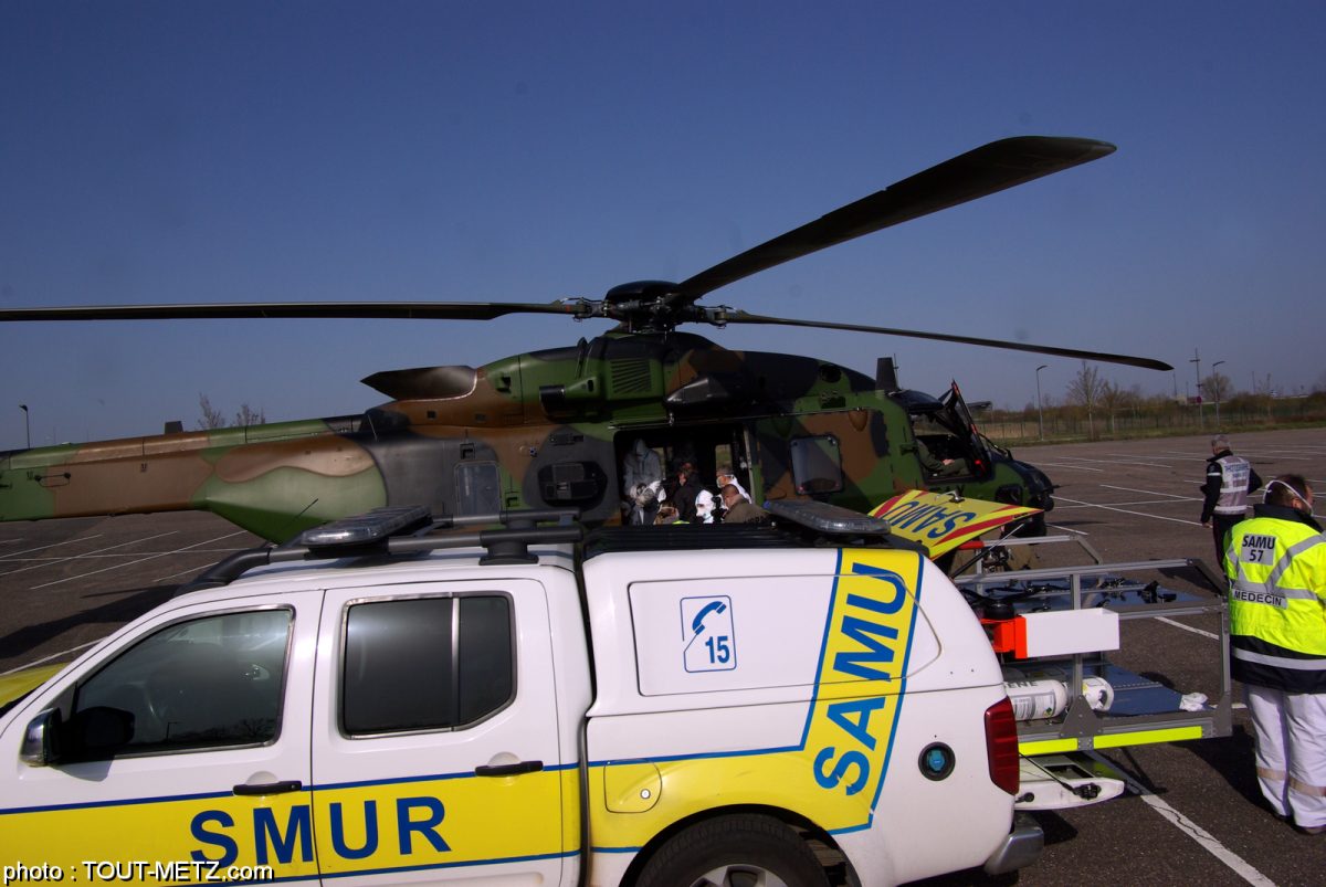 L’ hélicoptère militaire de modèle Caïman du régiment de Phalsbourg, s’est posé à Metz Expo vers 9h40 où deux ambulances et leurs équipiers l’attendaient. Après avoir monté deux patients à bord, l’hélicoptère a redécollé aux environs de 10h15 en direction de la ville de ESSEN (Nord de l’Allemagne) à 300km de là.
