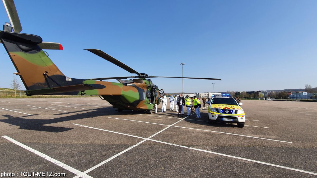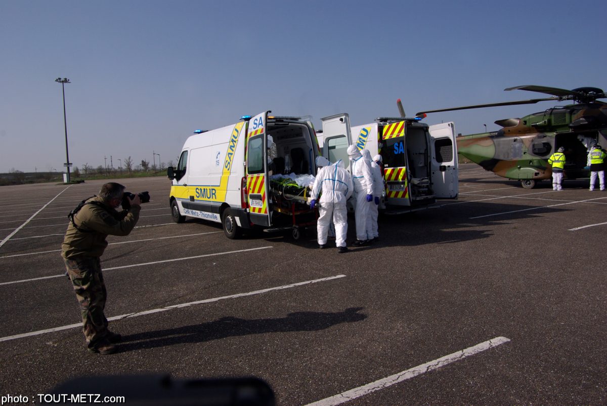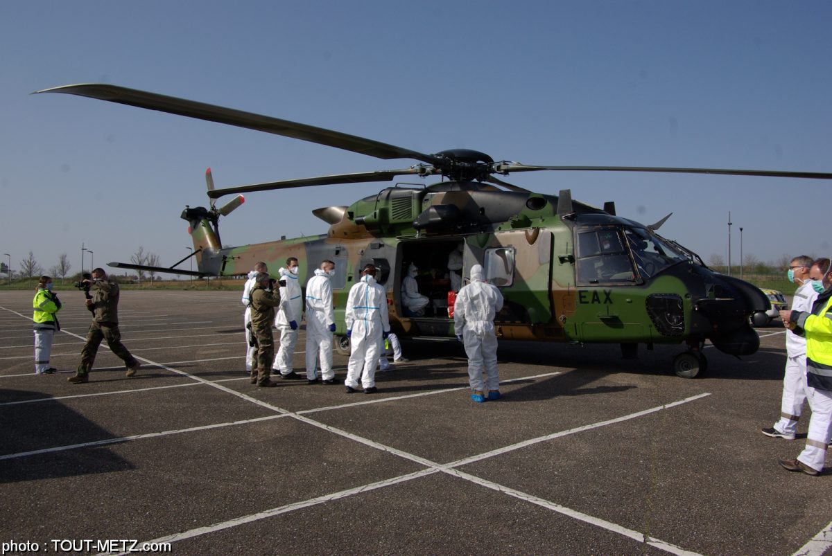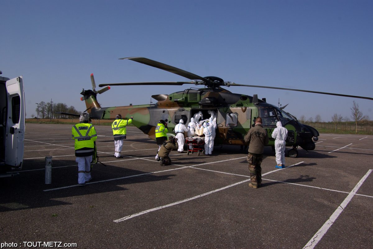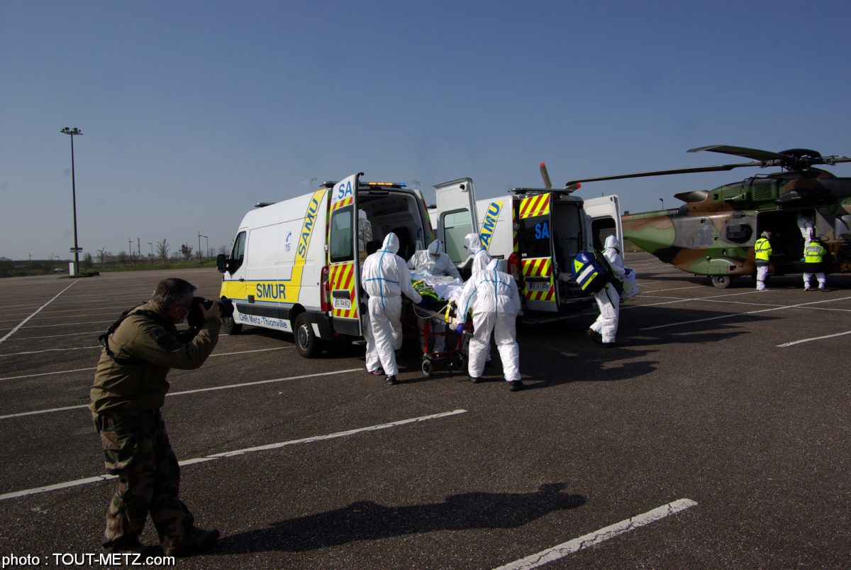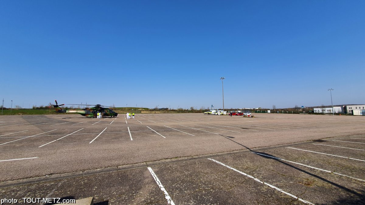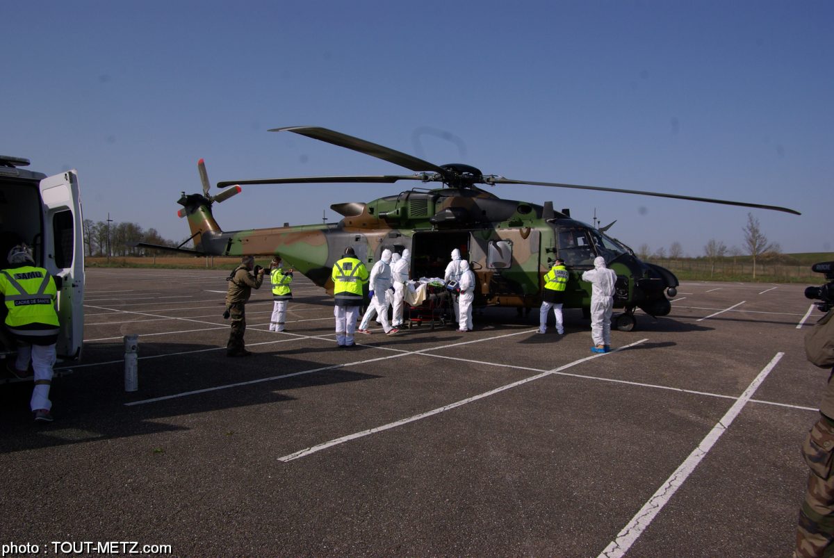 L’ hélicoptère militaire de modèle Caïman du régiment de Phalsbourg, s’est posé à Metz Expo vers 9h40 où deux ambulances et leurs équipiers l’attendaient. Après avoir monté deux patients à bord, l’hélicoptère a redécollé aux environs de 10h15 en direction de la ville de ESSEN (Nord de l’Allemagne) à 300km de là.