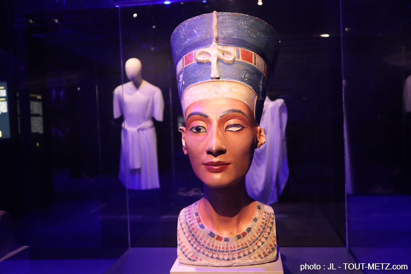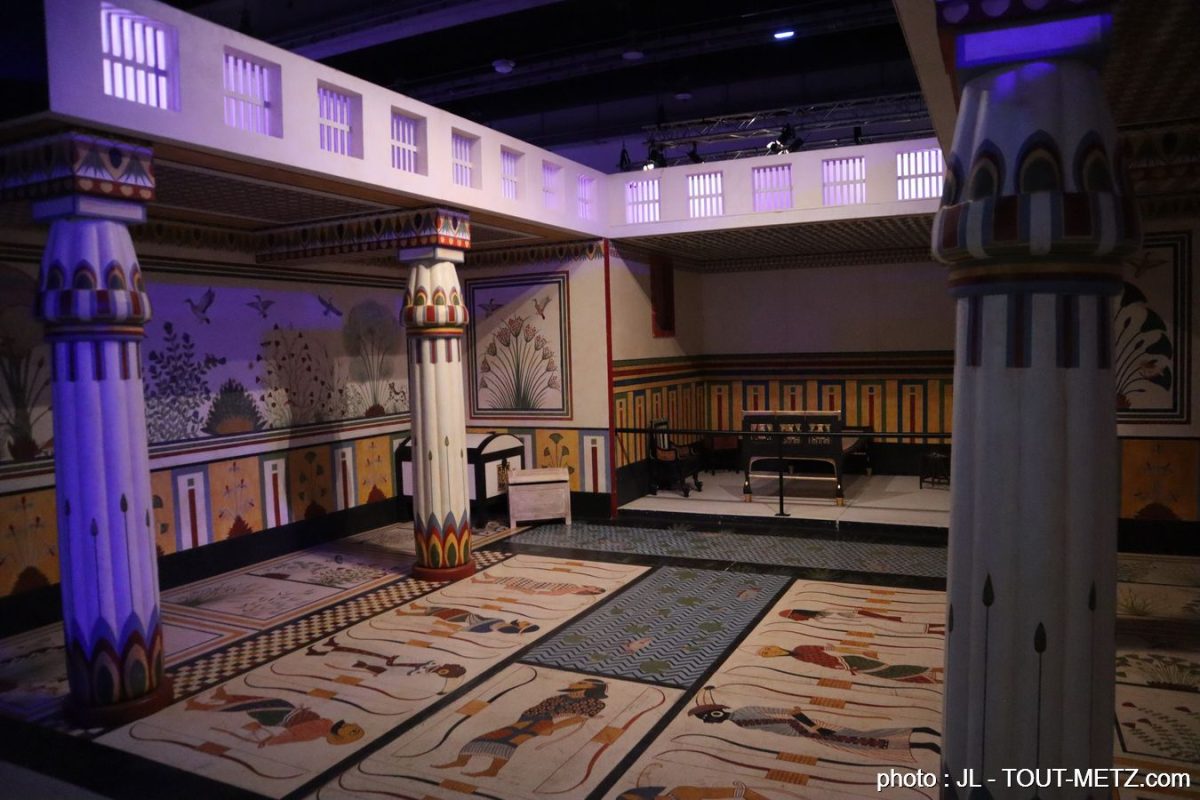 Pour l’occasion, le Palais des congrès se transforme en tombe égyptienne avec une reproduction de trois chambres funéraires à échelle réelle. Plus de 200 répliques « fac-similés » issues des ateliers du Musée du Caire, authentifiées par le Ministère des Antiquités Égyptienne, sont présentées dans des décors fidèlement reproduits.