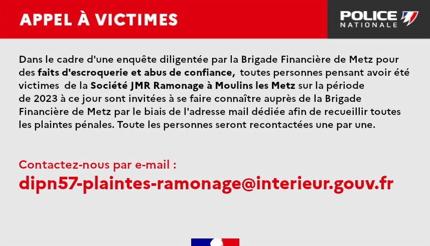 La bridage financière de Metz a diffusé ce jeudi 4 décembre 2025 un appel à victimes dans le cadre d’une enquête en cours portant sur des faits présumés d’escroquerie et d’abus de confiance en lien avec la société JMR Ramonage, installée à Moulins-lès-Metz. Les faits se seraient déroulés entre 2023 et aujourd’hui.