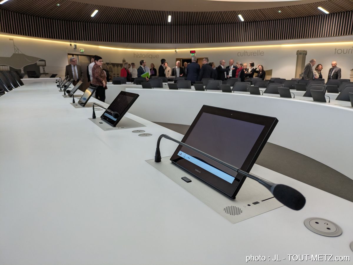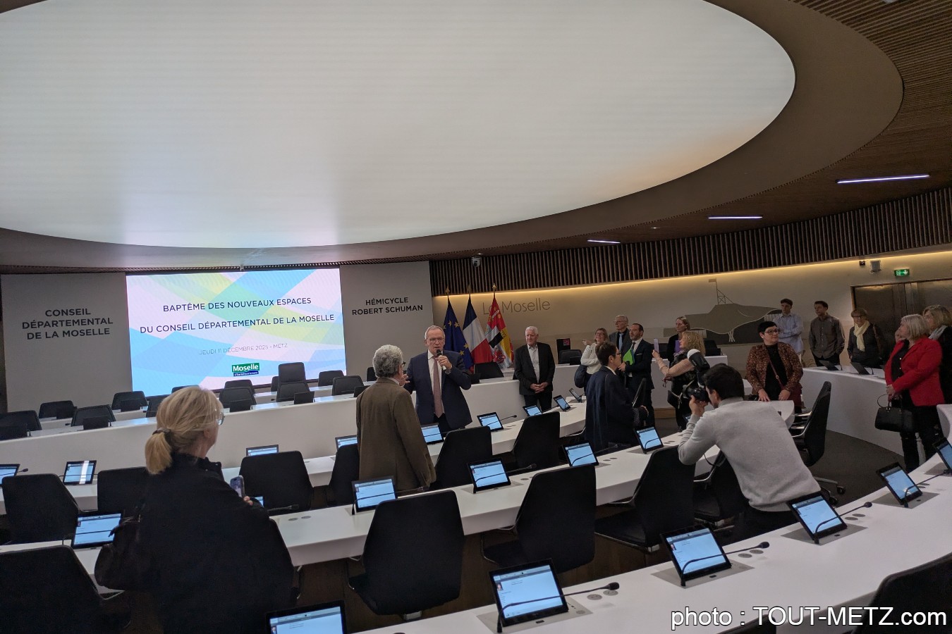 L’opération a permis la remise aux normes du bâtiment. Une nécessité en termes de respect de l’environnement : l’éclairage ancien a laissé place au LED. L’espace est désormais équipé d’un matériel de meilleure qualité, permettant par exemple d’accueillir un invité en visioconférence. Cette seconde vie est symbolisée par un nouveau nom : l’hémicycle porte désormais le nom de Robert Schuman, père fondateur de l’Europe et conseiller général de la Moselle de 1937 à 1949.