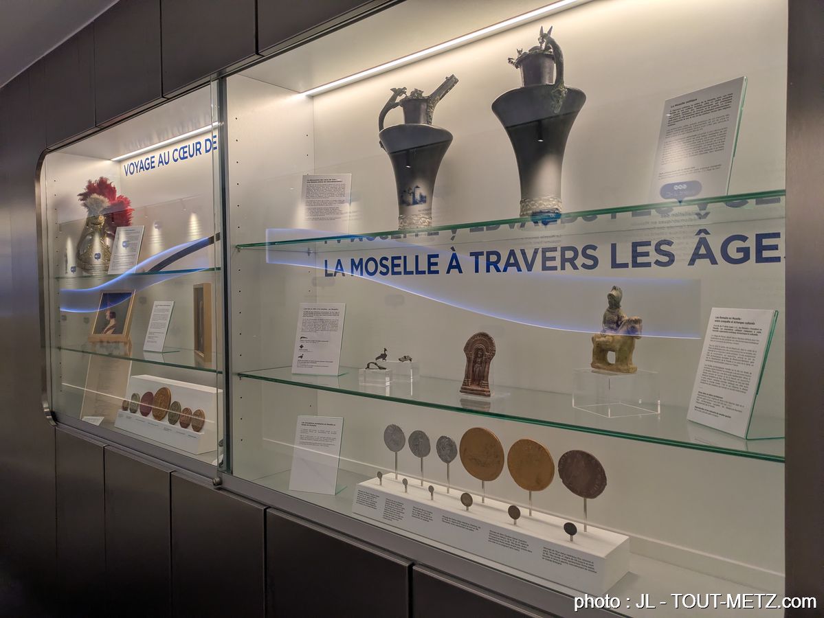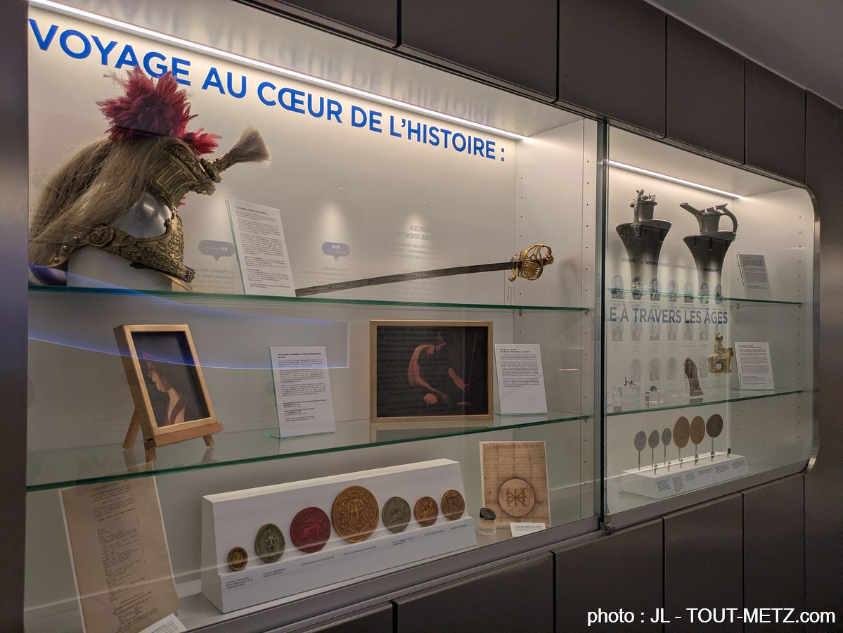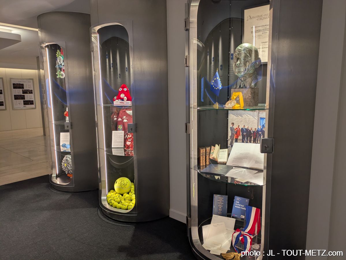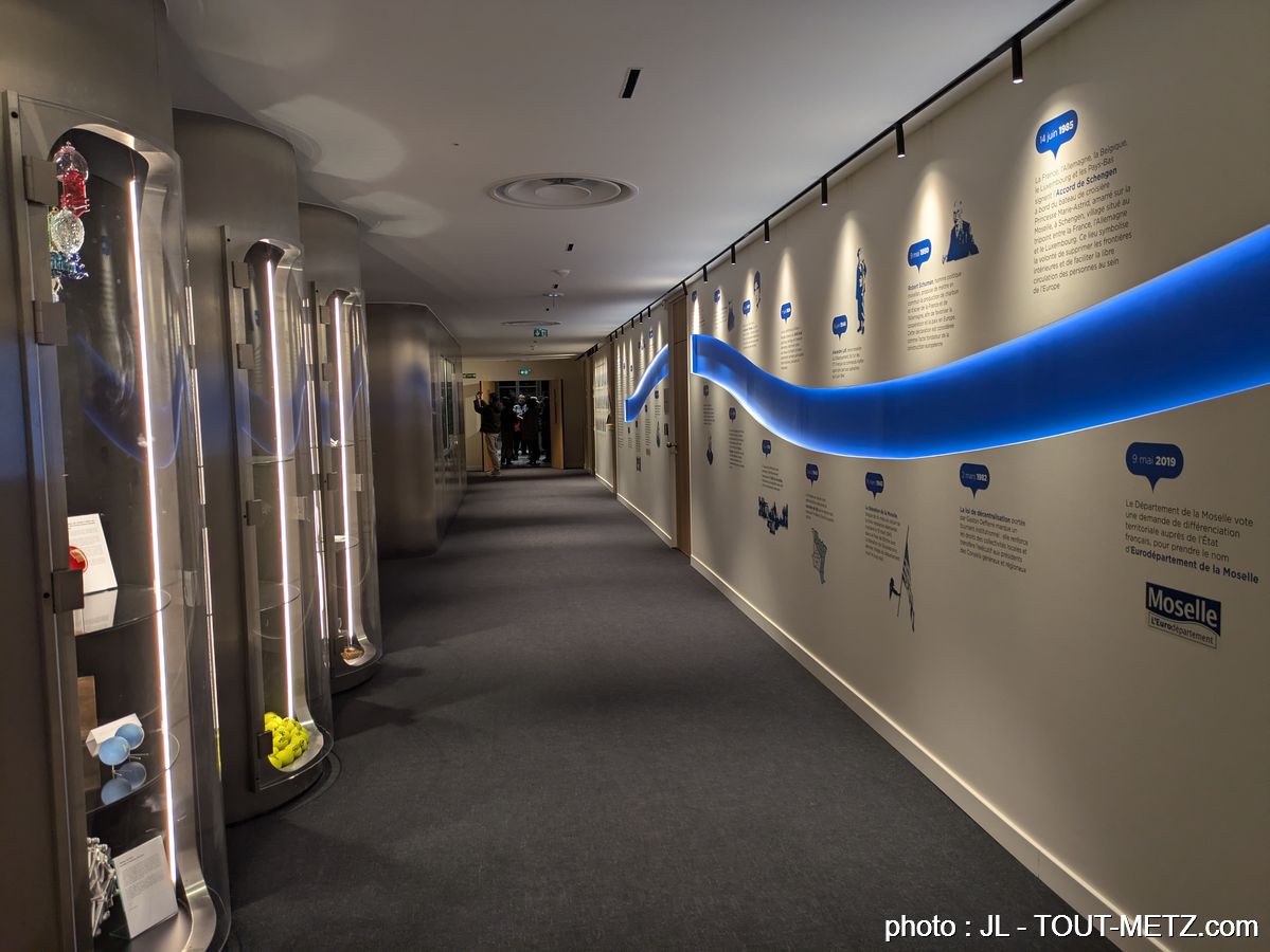 Une « galerie de la mémoire » présentant l’histoire de la Moselle fait la liaison entre les différents espaces. Elle rend hommage aux figures qui ont fait la Moselle, rappelle les grandes dates qui ont marqué les grandes heures et les périodes de souffrance, mais regroupe aussi de véritables objets d’histoire. Des productions de la verrerie de Meisenthal aux souvenirs du passage de la flamme olympique et quelques pièces anciennes, découvertes lors de fouilles archéologiques, le département se dévoile aux visiteurs en quelques vitrines. Près de 5 000 collégiens y passeront chaque année.