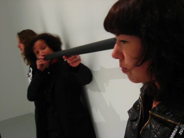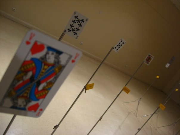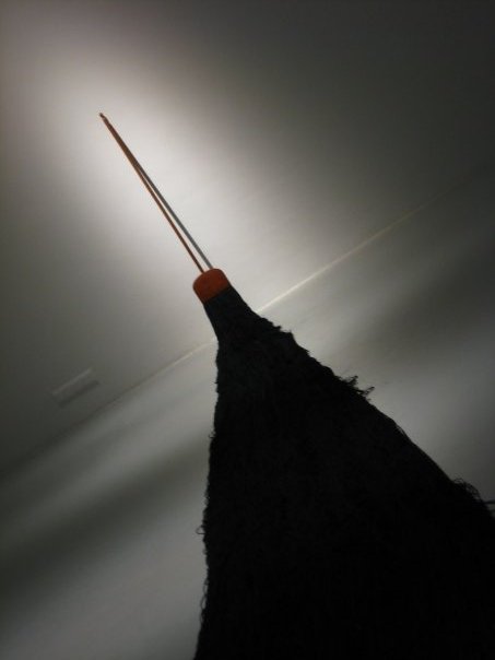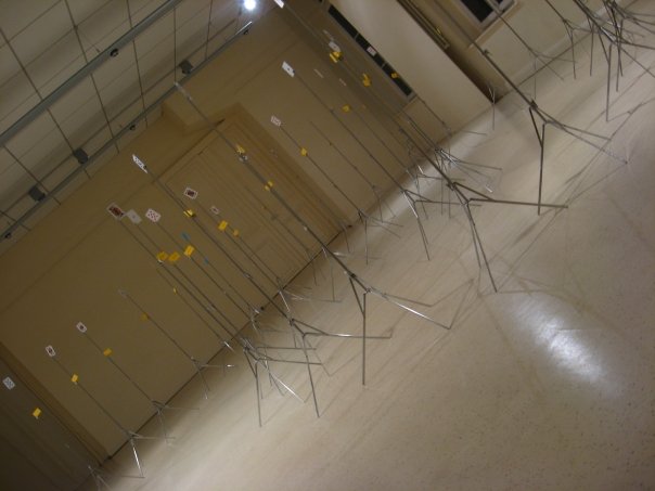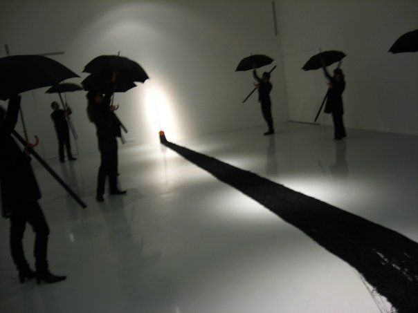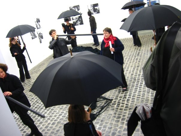 Suivre simplement les fils, passer dans chaque coins de pièces, escaliers et couloirs… et a travers différentes découvertes, admirer au hasard une projection vidéo, des photographies de performances… jusqu’à la salle révélatrice de l’apparition étrange de ces sombres fils : un balai adossé contre le mur, déversant son flot de franges au grand émerveillement du visiteur…